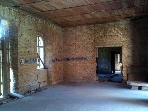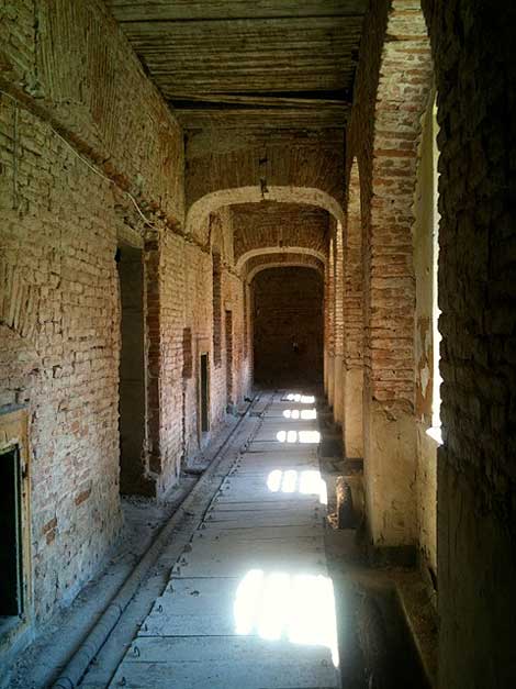 Zwischen Bäumen wird plötzlich der Blick frei aufs Schloss. Noch im Kommunismus wurde der Feuchtigkeit wegen der Putz abgeschlagen. Aber es sind auch alle Einrichtungsgegenstände verloren gegangen.